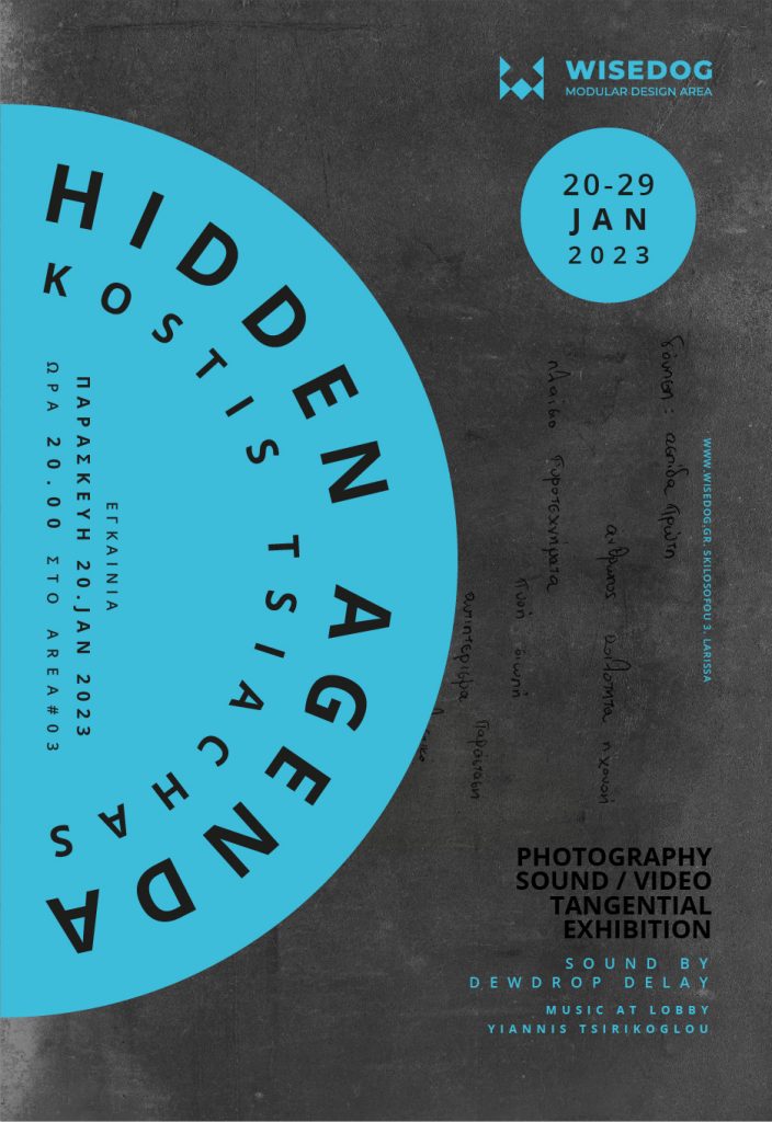 Το Wisedog ξεκινάει το 2023 εγκαινιάζοντας την Παρασκευή 20 Ιανουαρίου στις 20:00 στον υπόγειο εκθεσιακό του χώρο την πρώτη ατομική έκθεση φωτογραφίας του Κωστή Τσιάχα, με τίτλο “Hidden Agenda”, σε επιμέλεια Βαλεντίνης Μαργαριτοπούλου. Η έκθεση περιλαμβάνει την παρουσίαση του πολυμορφικού project με φωτογραφίες της σειράς “Hidden Agenda”, βίντεο και ηχητικά τοπία.