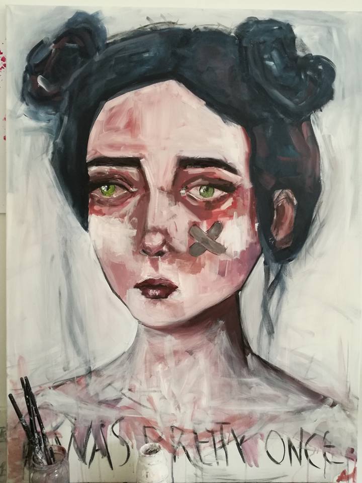 Μέσα από μία σειρά πορτρέτων ζωγραφισμένων με ακρυλικά πάνω σε καμβά, επιχειρεί να ξεκινήσει μία εξερεύνηση του αθώου και του γκροτέσκο μέσω δυνατών συναισθημάτων και με έντονο το στοιχείο της αποξένωσης. Η διαστρεβλωμένη εικόνα του εαυτού της, και εν γένει της ανθρωπότητας, αποτυπώνεται με τρόπο μοναδικό στα ανθρώπινα βλέμματα λειτουργώντας ως απαρχή ενός εσωτερικού διαλόγου σε πολλά και διαφορετικά επίπεδα. Βλέμματα αιχμηρά, βλέμματα δυνατά οπού νιώθεις την ένταση τους πάνω σου, σου μεταφέρουν ανησυχίες και θέτουν ερωτήματα.